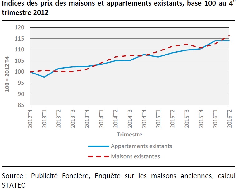 Par rapport au trimestre précédent, les prix des maisons existantes ont augmenté de 3.3% au 2e trimestre 2016, alors que les prix des appartements existants sont restés pratiquement stables. Sur un an, les prix ont augmenté davantage pour les appartements (+5%) que pour les maisons (+4,3%).